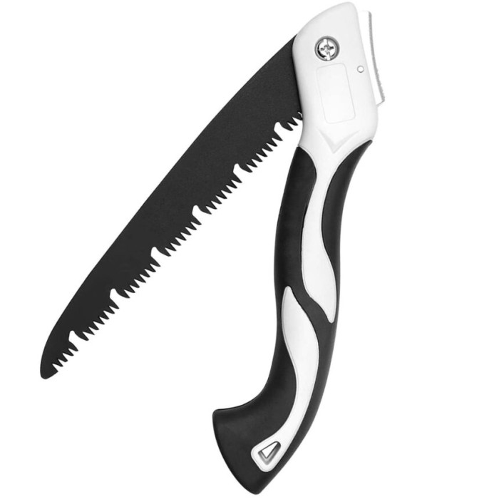 - 2. Sharp serrations: Tcutting surface of this saw is flat and not rough. It is a sharp tool for sawing branches, which is fast and labor-saving. 3. Humanized design: This saw can be quickly folded, with a lock design, tfolding invisible saw blade is wear-resistant, and tsoft rubber feels comfortable.